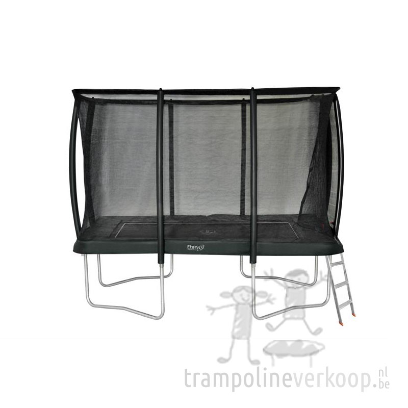 Deze rechthoekige Etan Premium Deluxe trampoline heeft een afmeting van 3,05 x 2,30 meter en wordt geleverd met een Deluxe veiligheidsnet en een trapje.